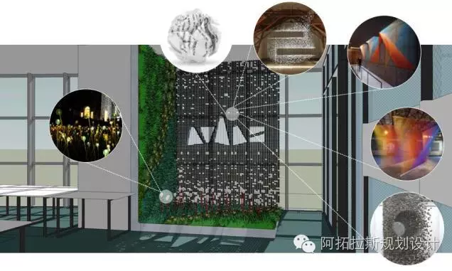在主区域设置三山两树,用现代手法表现日式庭院的。假山是用培养皿堆砌而成,在温差下内壁会形成水汽,下面设置灯光,会产生不同的漫射光。