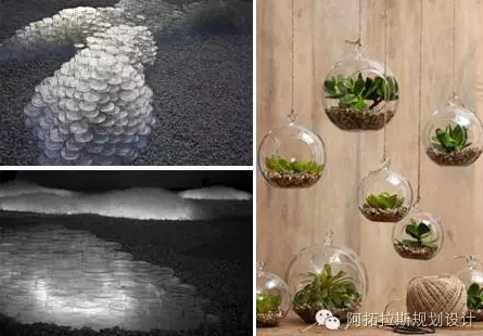 从入口处设置圆形的玻璃种植瓶,仿佛欲坠的露珠,一直延展至主要待设计区。