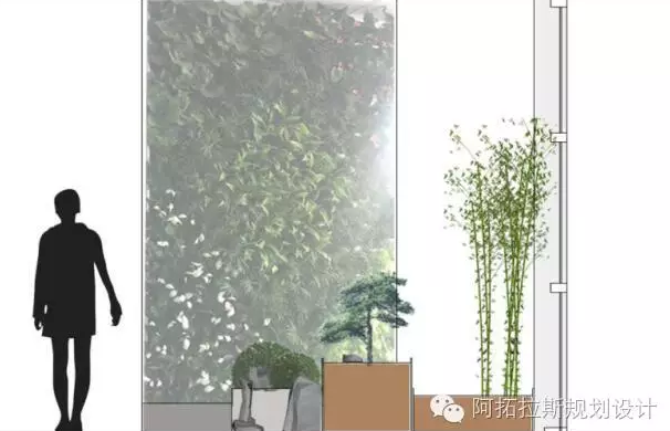 西侧为墙体绿化,绿化形式为现代几何形状。