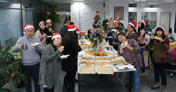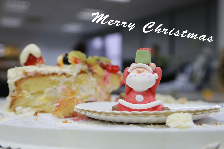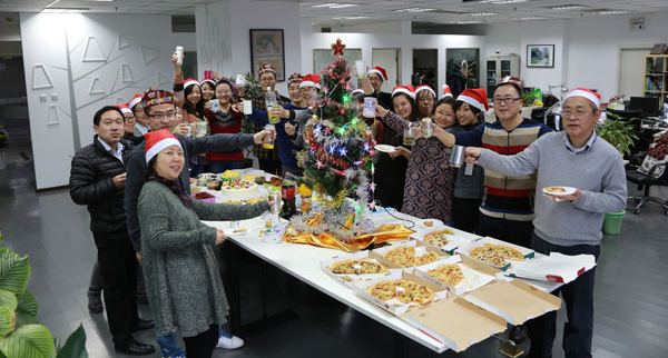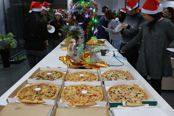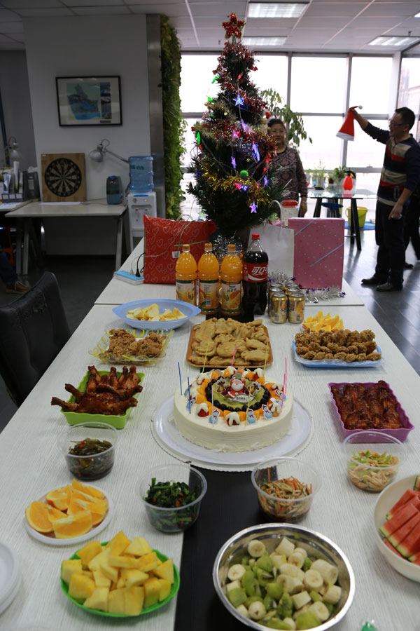 2013年12月25日圣诞节当天,办公司在大家的精心布置下,充满了浓郁的圣诞氛围和温馨的气息。下午时分,伴随着圣诞歌曲的旋律,大家以随机抽取的方式互换圣诞礼物,整个过程趣味十足。在分享礼物后又共享了美食,披萨、蛋糕、水果、炸鸡、凉菜、饮品等一应尽全,堪比圣诞大餐。在分享中大家一同度过了欢乐的圣诞下午。